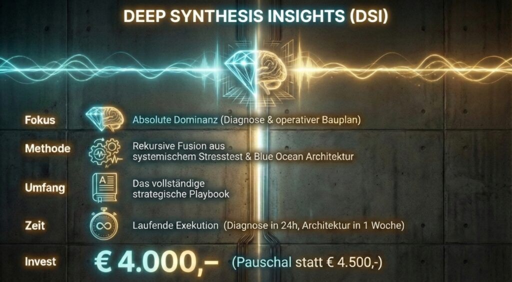 Es ist die finale Synthese aus menschlicher Kognitionstiefe und maschineller Härte. Keine Kompromisse. Entscheiden Sie sich nicht für das Nächstbeste. Entscheiden Sie sich für das Signal im Rauschen.