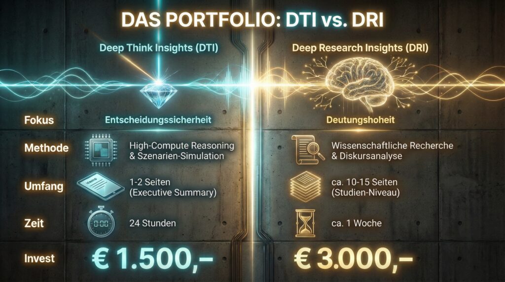 Wir vereinen den unerbittlichen analytischen Schnitt, die forensische Decodierung des verborgenen Resonanzraums und die Konstruktion Ihres neuen kulturellen Fundaments in einer einzigen, untrennbaren Architektur: DEEP RESEARCH INSIGHTS (DRI).